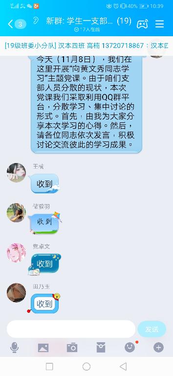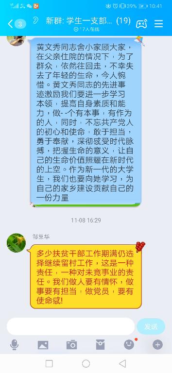 2019年11月8日15:00,根据上级党委通知要求,伟德betvlctor体育官网公司员工第一党支部利用QQ群网络平台,采取分散学习、集中讨论的形式举行了“向黄文秀同志学习”主题党日。本支部全体党员参加此次党日,由彭潇领学。