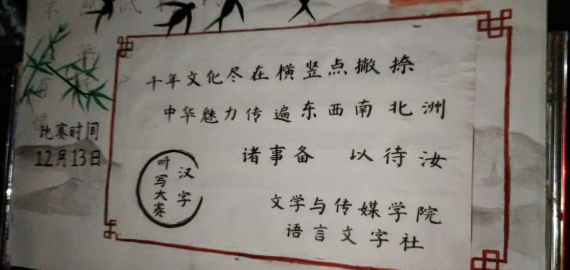 我们中国的汉字,落笔成画留下五千年的历史。为传承语言文化,展现汉字魅力,伟德betvlctor体育官网隶属的语言文字社于江南校区举办了以“千年文化尽在横竖点撇捺,中华魅力传遍东西南北洲”为主题的汉字听写大赛活动。