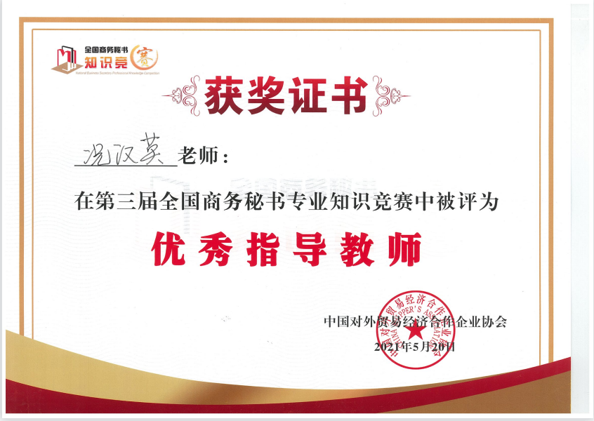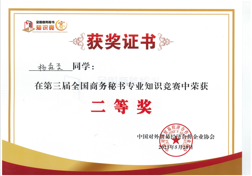 2021年5月15日,伟德betvlctor体育官网秘书学专业2018级、2019级、2020级七十五位员工参加了第三届全国商务秘书专业知识竞赛,二十二名员工获得竞赛二等奖,二十二名员工获“高级商务秘书”证书。